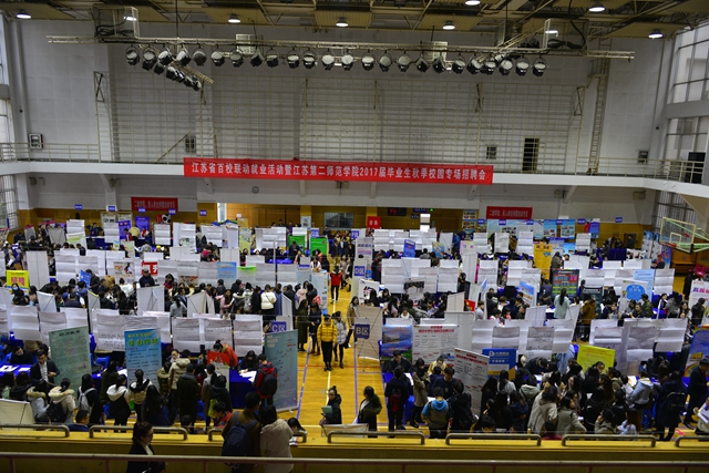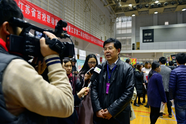 为进一步加强人才市场建设,搭建就业平台,更好地为毕业生就业提供服务,12月10日上午,我校在草场门校区体育馆举办“2017届毕业生秋季校园专场招聘会”。校党政领导高度重视,党委书记李洪天,院长王仁雷,党委副书记、副院长程建军等一早就来到招聘会现场,与用人单位和学生代表亲切交谈。此次招聘会得到省教育厅的关心支持,江苏省高校招生就业指导服务中心党总支书记胡建平、信息服务部副部长王华亲临现场视察并指导工作。