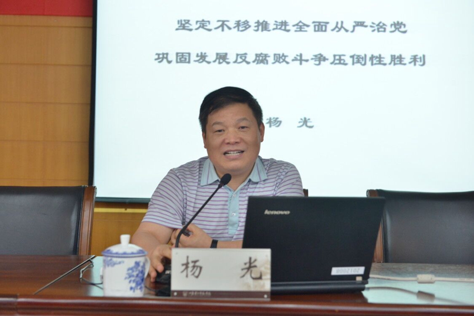 杨光作题为《坚定不移推进全面从严治党,巩固发展反腐败斗争压倒性胜利》的专题辅导报告。杨光针对十八大以来反腐败形势变化,结合具体典型案例,以案释法、以案明纪,从“挺纪在前,坚守住党的纪律和规矩的底线”“深化改革,实现对所有行使公权力监督的全覆盖”“认清形势,坚定不移推进全面从严治党向纵深发展”三个方面,对六大纪律的相互关系作了深入浅出的解读,对如何运用监督执纪“四种形态”作了详细的阐述。他强调,广大干部要在清正廉洁上作表率,知敬畏、存戒惧、守底线,清白做人,干净做事,让铁的纪律转化为大家的日常习惯和自觉遵循。