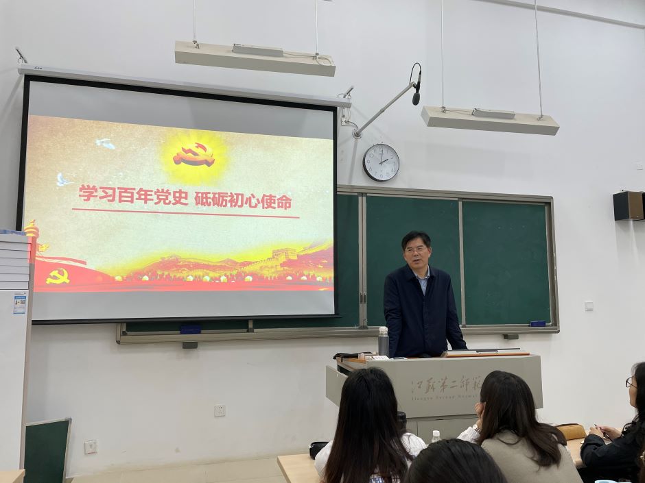 课堂上,王仁雷教授以党史学习教育的重要性为契入点,深刻阐释了在全党开展党史学习教育的重大意义。他指出,历史是最好的教科书,中国革命历史是最好的营养剂。学习党史,是坚持和发展中国特色社会主义、把党和国家各项事业继续推向前进的必修课。学习党史有利于提高政治判断力、政治领悟力、政治执行力,有利于弘扬党和人民在各个历史时期奋斗中形成的伟大精神。学百年党史就是要学党的理论探索史、始终践行党的初心使命的历史、党的不懈奋斗史。王仁雷教授结合百年党史三个伟大的历史飞跃,系统阐述了百年党史的基本脉络,详细介绍了我党百年历程中的重大事件,回顾了我党团结带领人民走过的光辉历程、取得的光辉成就。最后,他从人民就是江山的价值追求、科学正确决策的政治智慧、理论创新和理论武装全党的强大能力、党的自我革命硕果累累四个方面,总结了我党百年光辉历程所彰显出的党的特质。