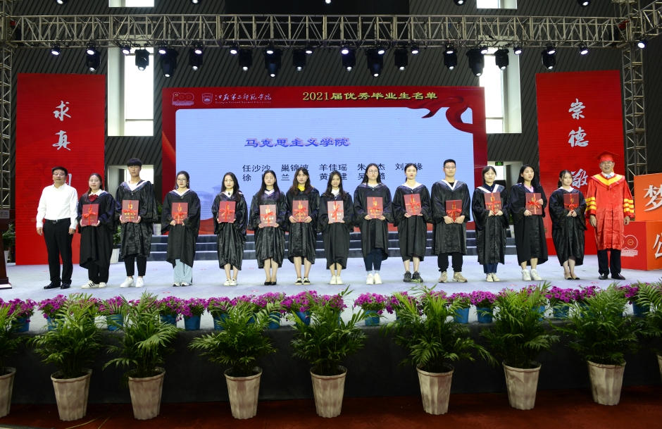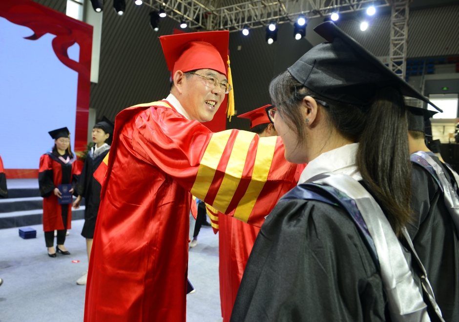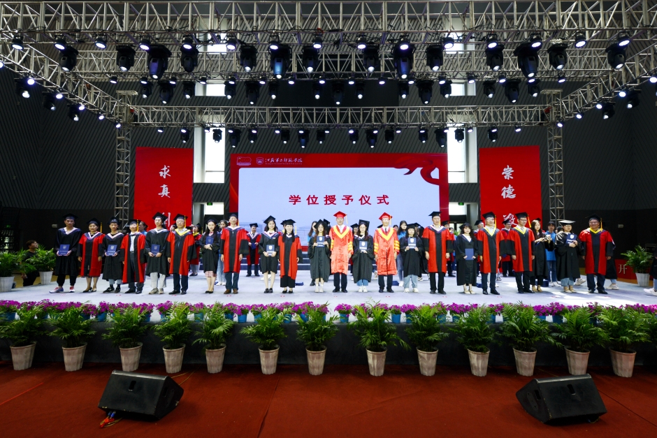 校领导、二级学院负责人、主要职能部门负责人为全体毕业生颁发毕业证书,为每一位学士学位获得者扶正流苏、授予学位证书并合影留念。