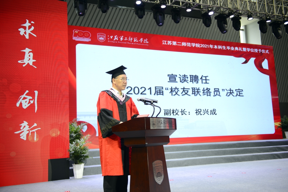 副校长祝兴成宣读2021届优秀毕业生表彰决定与2021届校友联络员聘任决定。王仁雷、薛凤冠为获奖学生代表颁发证书,王建为校友联络员代表颁发聘书。