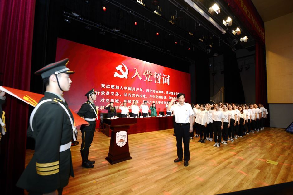大会在全场高唱国歌中拉开帷幕。王仁雷作为领誓人,带领全体新老党员面向党旗庄严宣誓:“我志愿加入中国共产党,拥护党的纲领,遵守党的章程,履行党员义务……” 一句句入党誓词铿锵有力、掷地有声,彰显了我院全体党员师生牢记使命、砥砺前行的坚定信念。