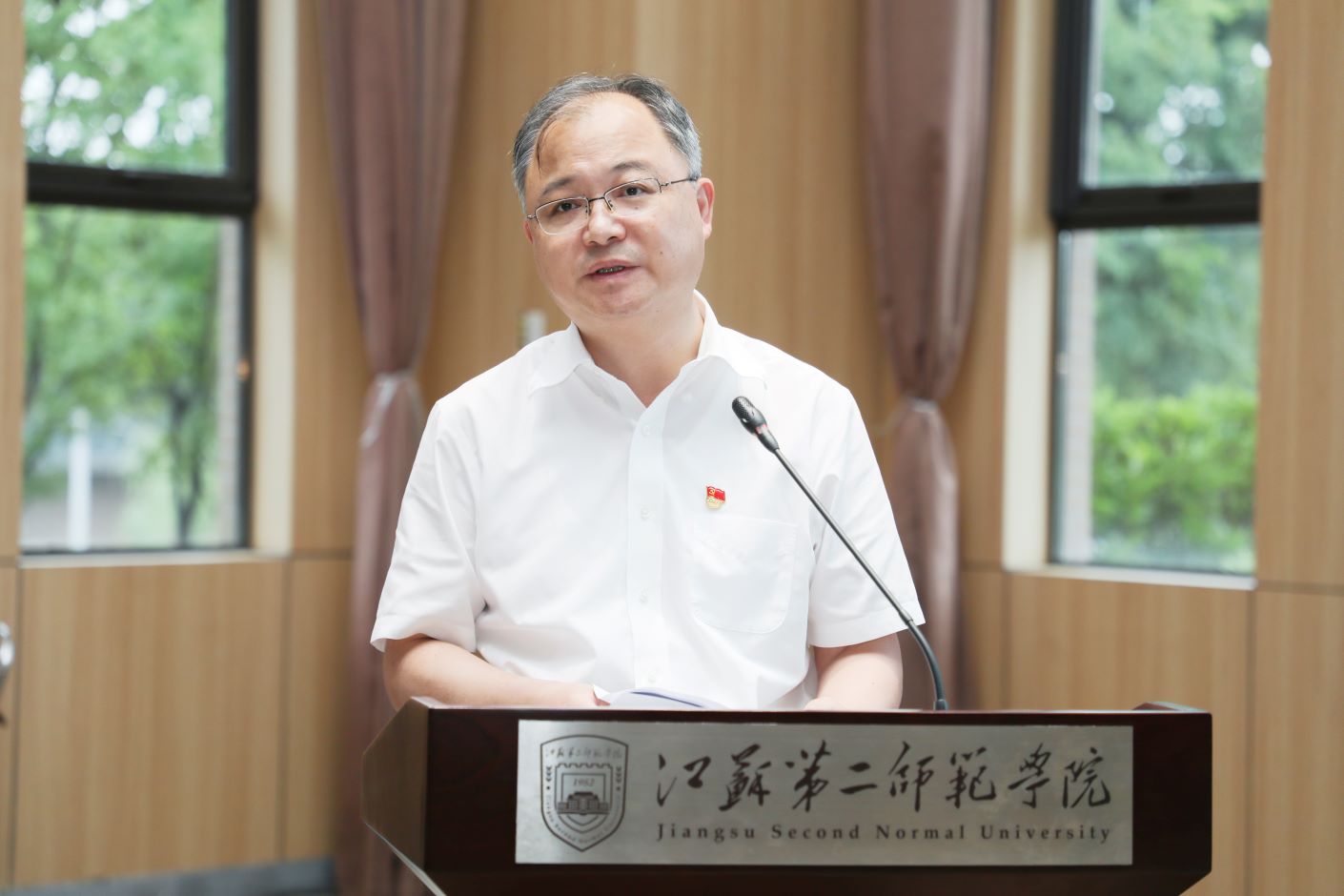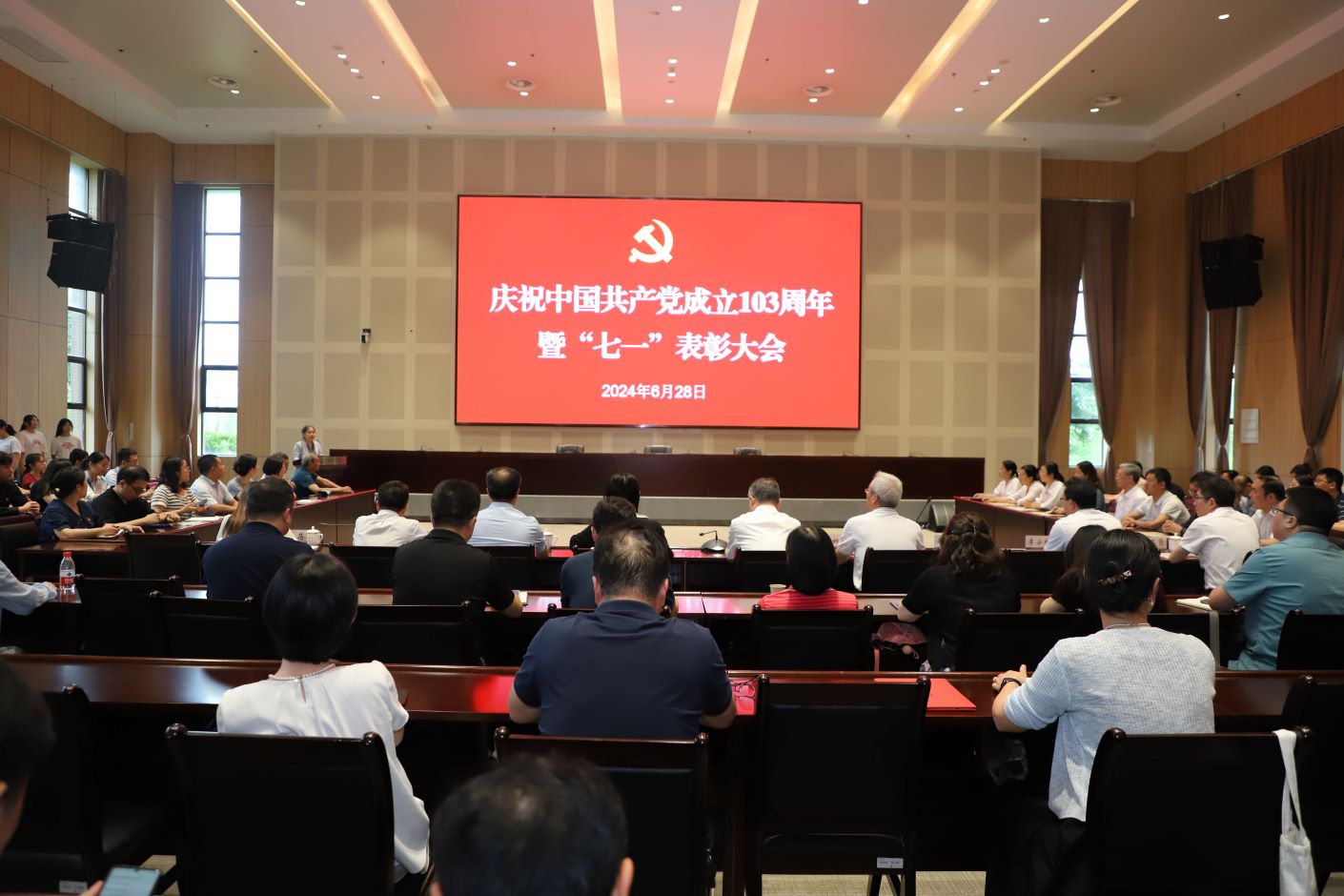 6月28日下午,我校庆祝中国共产党成立103周年暨“七一”表彰大会在石湫校区敬业楼107会议室召开,为“光荣在党50年”的老党员颁发纪念章,表彰一批为我校事业发展作出突出贡献的优秀共产党员、优秀党务工作者和先进基层党组织。全体在宁校领导出席会议,为受表彰的单位和个人代表颁奖。中层正职党员干部、教职工党员、离退休党员和学生党员代表,受表彰的先进集体和个人参加会议。党委书记王鲁沛为全体党员讲党课。党委常委、副校长赵玉蓉主持会议,并宣读表彰决定。