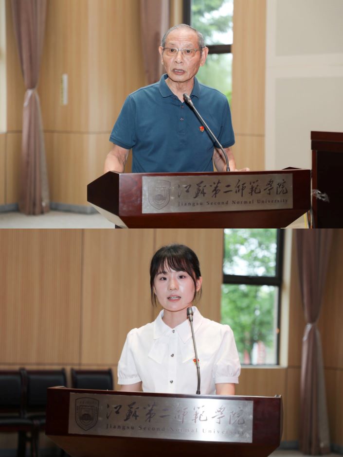 “光荣在党50年”老党员代表陈楙华、优秀学生党员代表杨童舒分别在大会上发言。陈楙华结合自身工作及成长经历,深情回望了中国共产党人的初心使命和奉献精神,展现出坚定不移跟党走的决心和“一生为党”的坚定信仰。杨童舒表达了对党的培养的感激之情,并表示要努力践行党的宗旨,发挥先锋模范作用,许党报国,不负韶华,勇做走在时代前列的奋进者、开拓者和奉献者。