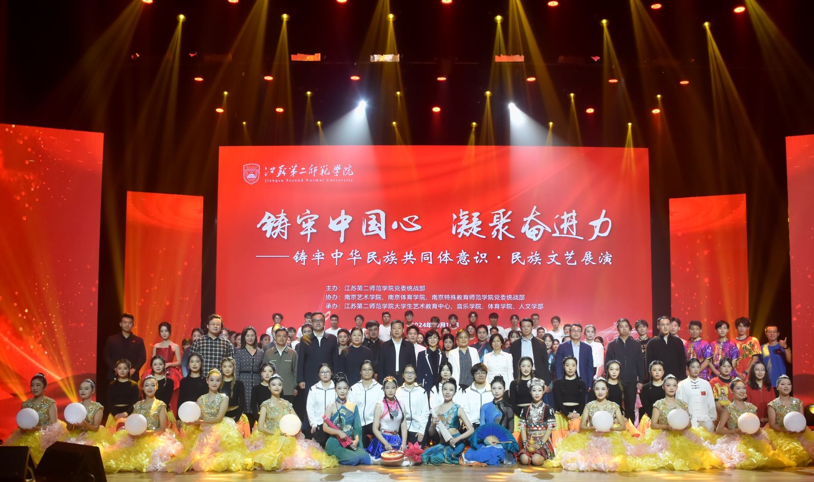 为进一步加强铸牢中华民族共同体意识教育,10月16日下午,我校在石湫校区尚美楼二楼报告厅举办“铸牢中国心 凝聚奋进力”——铸牢中华民族共同体意识·民族文艺展演。省委统战部二处副处长陈雪晴,市委统战部一级调研员张福东,市委统战部新阶层处处长徐静,市民宗局党组成员、副局长张颖华,市民宗局民族处副处长郭震,鼓楼区委统战部副部长、民宗局局长任明璋,溧水区委统战部副部长、民宗局局长高明芳,南京体育学院党委常委、党委宣传部、统战部部长许立俊,南京特殊教育师范学院党委常委、党委统战部部长、学生工作处处长高飞,江苏第二师范学院党委常委、副校长赵玉蓉,党委常委、党委宣传部部长李安林,党委常委、党委统战部部长陈蓓,南京艺术学院等兄弟院校师生代表,江苏第二师范学院统一战线工作领导小组、民族宗教工作领导小组成员、师生代表观看演出。赵玉蓉代表学校致辞。