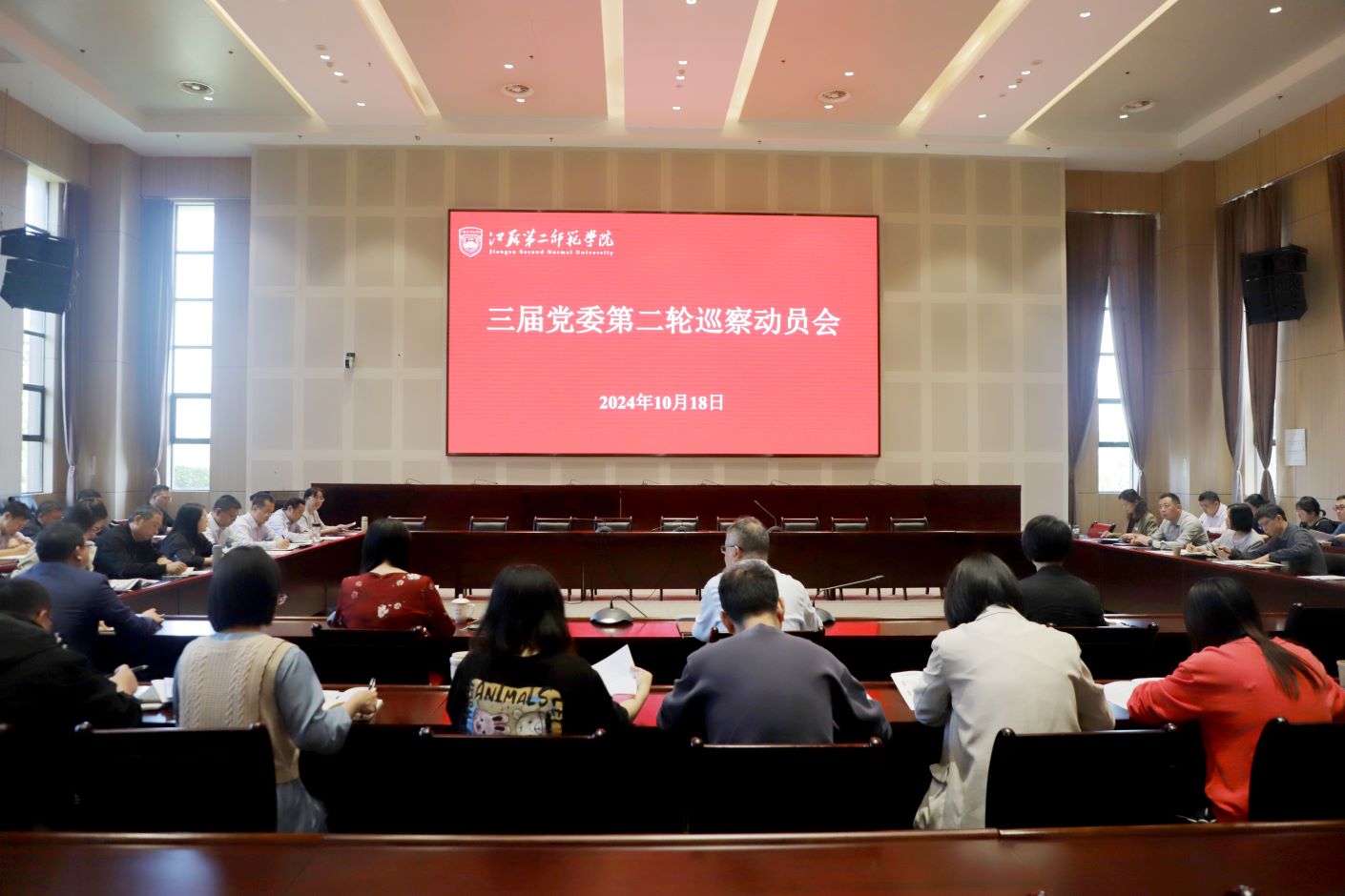 10月18日下午,我校在石湫校区敬业楼107会议室召开三届党委第二轮巡察动员会。会议深入学习领会习近平总书记关于巡视工作的重要论述和关于教育的重要论述,学习贯彻党的二十届三中全会和全国教育大会精神,全面落实中央、省委、校党委关于巡视巡察工作部署要求,对本轮巡察进行部署安排。党委书记、巡察工作领导小组组长王鲁沛出席会议并讲话,党委副书记、副校长、巡察工作领导小组副组长刘继红,党委常委、纪委书记、巡察工作领导小组副组长、巡察办公室主任崔燕出席会议,各二级党组织书记、校纪委委员、被巡察党组织领导班子成员以及巡察组全体人员参加会议。会议由刘继红主持。