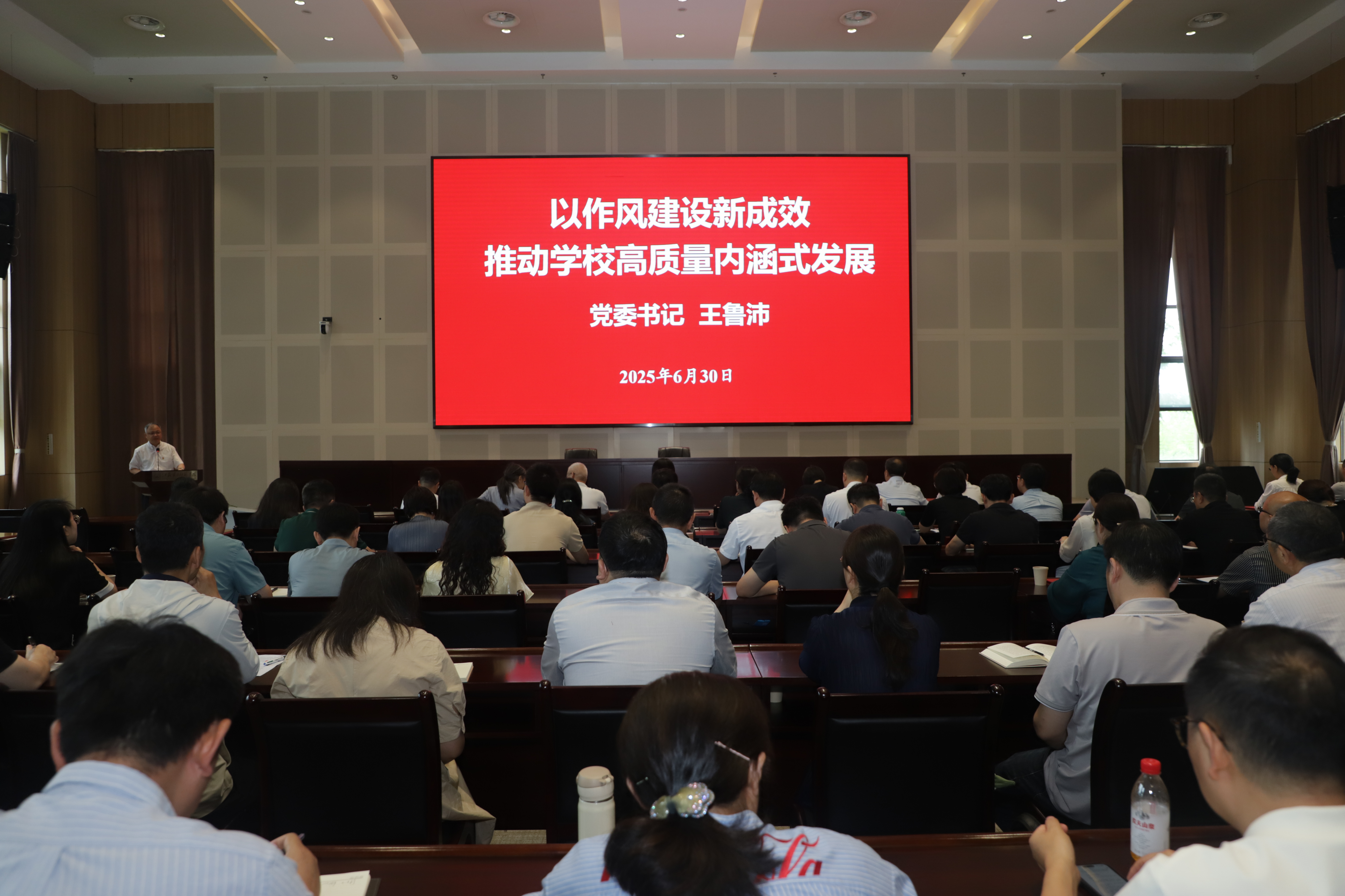 王鲁沛代表校党委向受表彰的先进集体和个人表示祝贺,向全体党员致以节日的问候,围绕“以作风建设新成效推动学校高质量内涵式发展”讲授专题党课。他指出,要充分认识中央八项规定精神的重要意义,提高政治站位,坚持问题导向,改进文风会风作风,筑牢廉洁自律防线,知敬畏、找差距、见实效,切实把学习教育成果转化为推动学校事业高质量发展的实际成效。他强调,全体党员、干部要围绕学校中心工作,锲而不舍地学习贯彻落实中央八项规定精神,扛牢职责使命,勇于担当作为,以先进为榜样,以优良作风凝心聚力、干事创业,奋力开启特色鲜明高水平大学建设新征程,在教育强国建设中谱写二师新篇章。