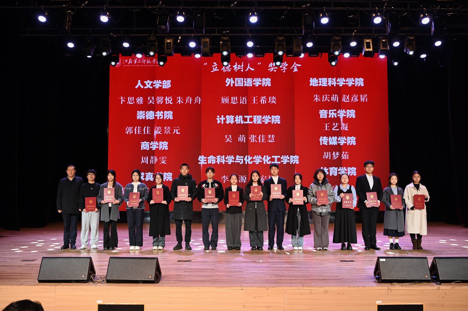 江苏省教育基金会理事长张兆臣为获得“立德树人奖学金”的学生颁奖。