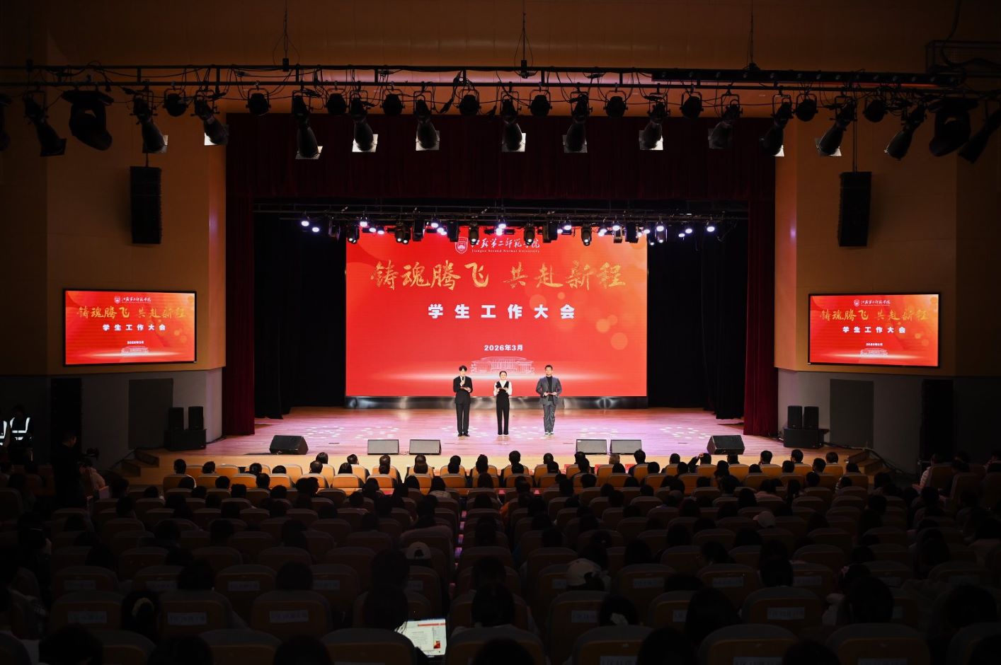 大会回顾了学生工作“铸魂腾飞”行动计划启动以来的育人成果。2023年起,学校紧扣“时代新人铸魂工程”和“新时代立德树人工程”的要求,系统构建以思想价值“引领”、生涯教育“导航”、全面发展“有恒”、未来人民教育家“锻造”为核心的学生工作育人体系。近三年,从学子奔赴西部基层到在各类竞赛中屡获佳绩,从奖助学金精准帮扶到育人成果不断涌现,“铸魂腾飞”正从蓝图愿景走向育人品牌。